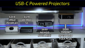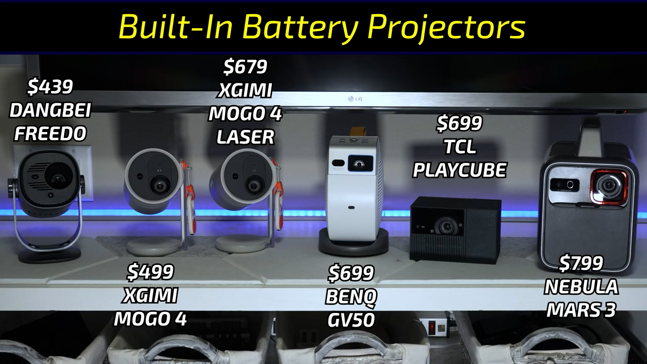 But first, to be able to review portable projectors this year, I needed a clear definition of what makes a projector portable. So, for this video, all the projectors needed to either have a built-in battery like the Dangbei Freedo, XGIMI MoGo 4, XGIMI MoGo 4 Laser, BENQ GV50, TCL PlayCube, and Nebula Mars 3 or they had to be able to be powered by a USB-C battery bank like the JMGO PicoPlay, Wemax S5, NexiGo Nova Mini, and Epson LifeStudio Flex Plus.