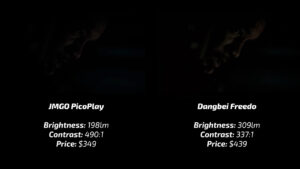 Last year the BENQ seemed like a very decent recommendation at that same $599 price point, but a few weeks after releasing that video BENQ raised the price to $799, which despite the GV50’s excellent speakers and great form factor, is way too much for 350 usable lumens. I feel similarly about the XGIMI MoGo 4 and MoGo 4 Laser, Dangbei Freedo, and JMGO PicoPlay that have such low brightness that they feel more like expensive toys rather than useable projectors. I think most people will be disappointed in their brightness, especially considering their relatively high prices in a world where extremely cheap single LCD projectors like the $50 HY300 exist. But if I had to pick the one with the best price to performance ratio it would easily be the Dangbei Freedo which had nearly as much brightness as the BENQ, decent speakers, and good picture quality for considerably less money.
