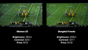 Round 3 was the $519 Wemax S5 on the left against the $439 Dangbei Freedo on the right. When I first turned on the Wemax, the image processing made the grass at Beth Page look neon in some areas and black in others, and the same was true for the turf in Montana’s stadium and Dani’s skin in Gemini Man looked like she was a burn victim. Thankfully raising the brightness and contrast, reducing the saturation, and setting the sharpness to zero made the resulting image much more reasonable though the overall color accuracy was still pretty bad.