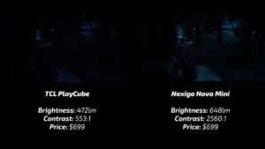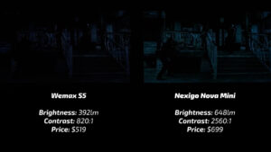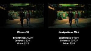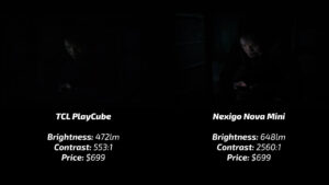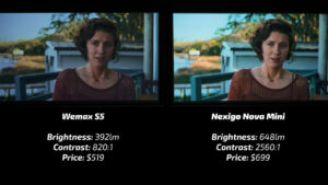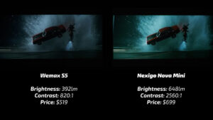 That means in round 5 the $519 Wemax S5 is on the left and the $699 NexiGo Nova Mini is on the right. With the NexiGo having nearly double the brightness of the Wemax, this was testing the limits of what my camera could properly capture, so you’ll just have to take my word for it that the NexiGo wasn’t blowing out highlights in person. The difference in picture quality was staggering in basically every scene, but the shadow detail and highlights in the darkest scenes were comparatively incredible on the NexiGo thanks to its scene adapt engine dynamic contrast system, and moderately lit scenes were vibrant and punchy without being oversaturated.