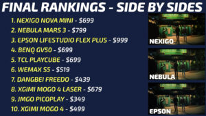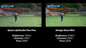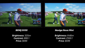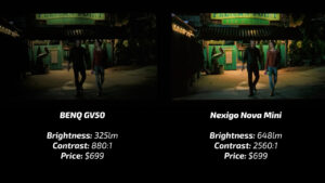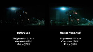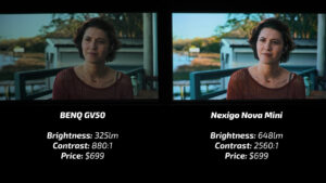 Round 6 then puts the $699 BENQ GV50 up against the $699 NexiGo Nova Mini. If these were strictly home theater projectors, I might deduct points from the NexiGo for doing such aggressive gamma manipulation which results in an overall brighter picture with more detail in midtones, but for a portable projector with limited brightness this is exactly how tone mapping should be handled. While the GV50 was extremely color accurate, especially in bright scenes, I think most people would choose the image from the NexiGo nine out of ten times. For fun, I also compared the Vibrant setting on both projectors for watching sports, and again, I really can’t fault the GV50’s image at all. It looks really good for a 325-lumen projector but the NexiGo with double the brightness, dynamic dimming, and excellent image processing made it the clear choice for a projector that is ultimately designed for more temporary setups.