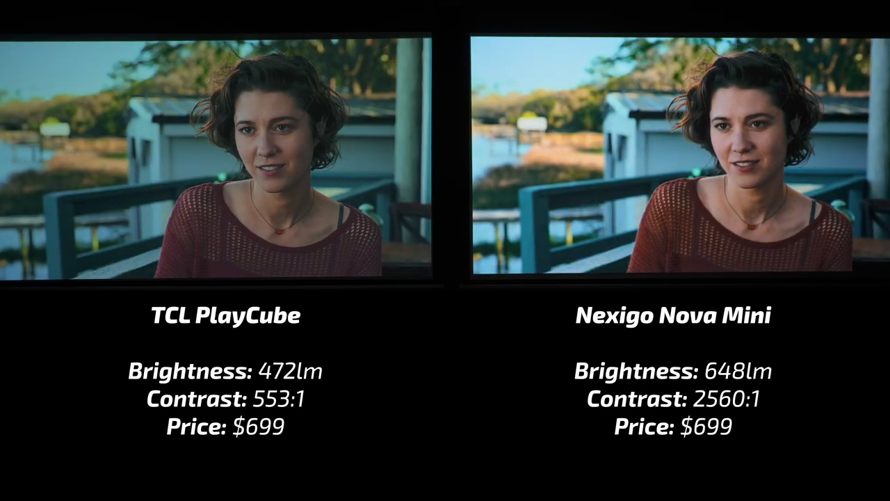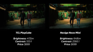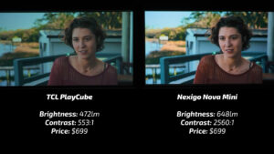 Next in round 7 the $699 TCL PlayCube is on the left and the $699 NexiGo Nova Mini is on the right. While the TCL has an option to enable dynamic contrast in its settings, from what I could tell it only works on completely black screens like in between names in credits and when loading apps like Netflix. While the PlayCube is substantially brighter than the BENQ GV50 from last round, the color accuracy and contrast are not as strong. While bright scenes looked better on the TCL with Dani’s skin being a little undersaturated and Henry’s being a little oversaturated, moderately lit scenes significantly favored the NexiGo, and the darkest scenes were absolutely no contest. Projectors can get away with poor tone mapping if they have excellent contrast and can make up for poor contrast with good tone mapping, but the TCL lacked both and lost a ton of shadow detail. While the NexiGo wasn’t perfect, with some brief color shifts, it was in a whole different league than the TCL and the NexiGo was the clear winner in this round also.