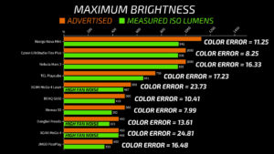 Starting with brightness testing, which is by far the most important aspect of a portable projector, but also the one that you can basically never trust when looking at manufacturer claims. The maximum brightness advertised will almost always be in a mode that you’d never want to use, but I started my testing by verifying brightness claims. Here are the advertised lumens compared to what I was able to measure, and you can see that the only projectors that were remotely usable in their brightest modes were the NexiGo Nova Mini, Epson LifeStudio Flex Plus, BENQ GV50, and Wemax S5 and the rest had unacceptable compromises in fan noise, color accuracy, or both.