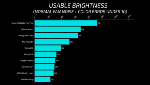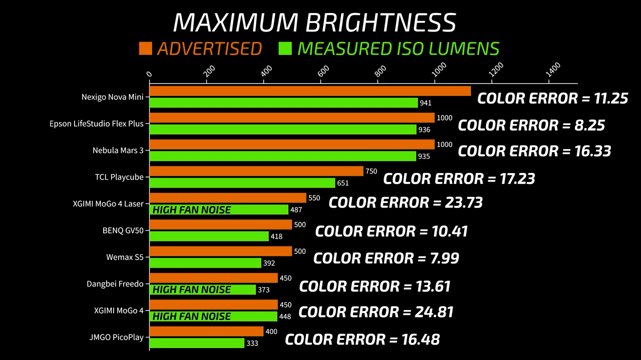 Next, I measured their highest usable brightness, which I defined as having no compromises in fan noise and color accuracy error under 10. While the Epson came out on top, the most interesting result was that the XGIMI MoGo 4 which is advertised at 450 maximum lumens was slightly brighter than the more expensive XGIMI MoGo 4 Laser which is supposed to have 550 max lumens. But from a usable brightness standpoint there is basically no difference between the two.