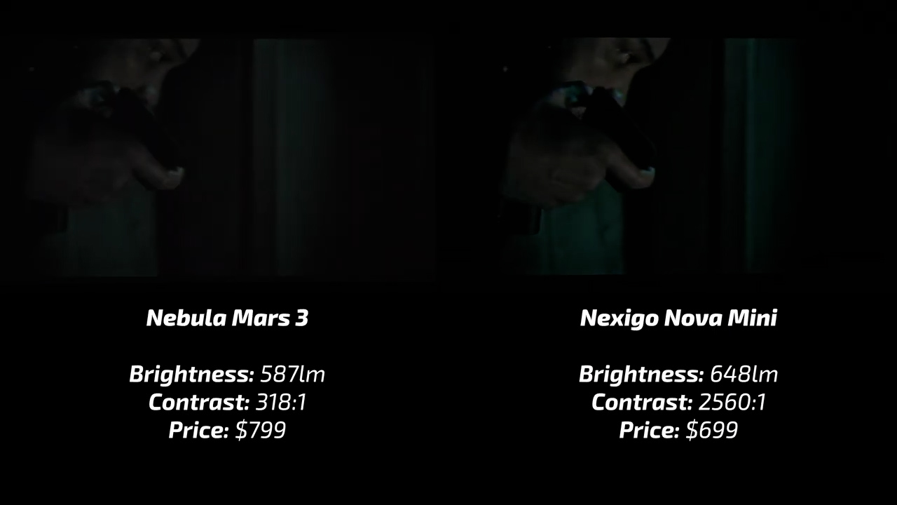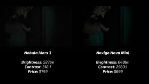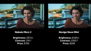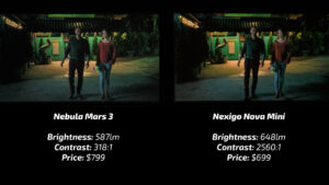 That makes round 8 the $799 Nebula Mars 3 on the left vs the $699 NexiGo Nova Mini on the right. This is actually the 3rd year that the Nebula has been in this portable projector video, not only due to its rugged form factor and huge internal battery, but I also loved the tone mapping in dark and moderate scenes, which again, for a portable projector will just make the image so much more watchable in imperfect environments. However, you can see that the NexiGo Nova Mini just takes that aggressive tone mapping and adds double the native contrast and dynamic laser dimming to the equation. You can find some scenes where there isn’t too much of a difference between the two projectors, but when the NexiGo is using all of its tricks, the choice is easy, and again, the NexiGo easily took this round.