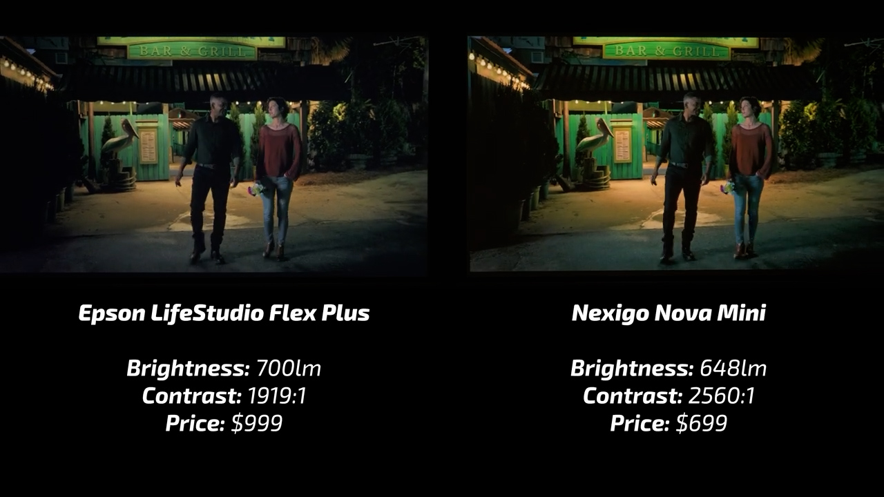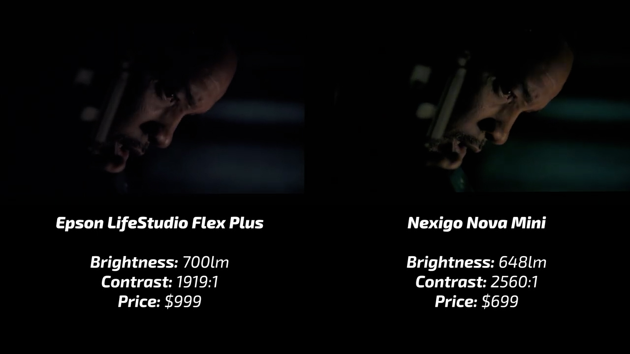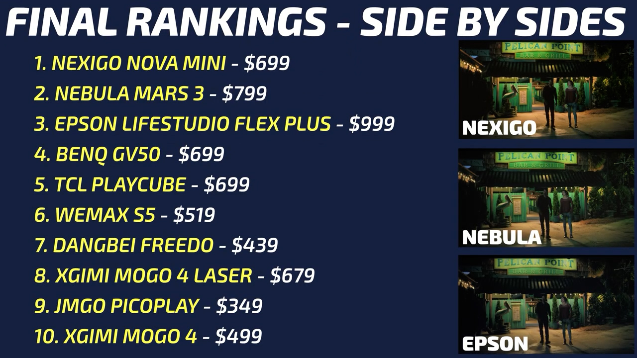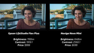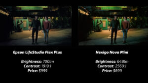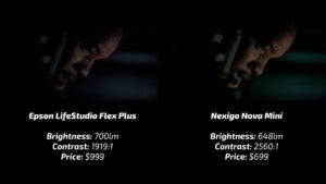 In the final round the $999 Epson LifeStudio Flex Plus is on the left and the $699 NexiGo Nova Mini is on the right. Even though the NexiGo has 200 more advertised lumens, both the usable and color accurate lumens on the Epson are higher. In bright scenes the Epson seemed slightly more color accurate despite being a little oversaturated. But the biggest difference to me was how flat the Epson looked compared to the NexiGo, which is surprising because they both have essentially the same native contrast ratio and both have dynamic contrast enabled. But as I mentioned, not all dynamic contrast systems are made equal, and the NexiGo absolutely dominated the Epson in dark scenes and moderately lit scenes. Even the brightest content favored the NexiGo with the higher contrast leading to greater perceived depth and sharpness.