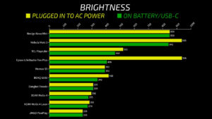 When running on batteries the dimmest projector was the JMGO PicoPlay, which to be fair had the same low brightness on AC power as well. The XGIMI MoGo 4 and MoGo 4 Laser lost just a fraction of their brightness when using their internal batteries. The BENQ GV50 drops down to around 340 lumens when you unplug the power adapter. The Dangbei Freedo maintains the same 390 max lumens on battery power while the Epson LifeStudio Flex Plus loses over half of its brightness when powered by USB-C. The Wemax S5 has the same peak brightness whether it’s plugged in or running on battery. The TCL PlayCube loses a small fraction of its brightness on battery and impressively both the Nebula Mars 3 and the NexiGo Nova Mini both output more than 800 lumens on battery, nearly twice as much as the next brightest group.