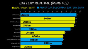 As for runtime, four of the projectors were around 2 hours of playback at their highest usable brightness. The Wemax S5 ran for 10 minutes less than that using the Anker battery bank. Then there was a group around 90 minutes total, and the Dangbei Freedo had the lowest battery life at just over an hour of playback. But don’t forget that these were all at different brightness levels, and if we multiply the lumens by the time, you can get a better idea of battery performance. For the brighter projectors, if you’re willing to sacrifice some brightness you can turn the light source power down to get some extra playback time.