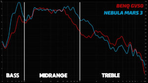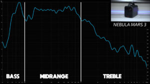 The BENQ GV50 was the next loudest at 81.8 dBA average but compared to the Nebula you can see that the bass doesn’t have as much presence as the midrange and the midrange trails off earlier, which could lead to some loss in vocal clarity.