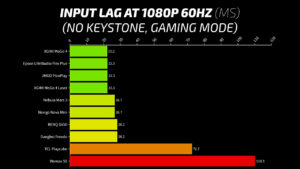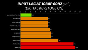 In addition to testing for their lowest input lag, which happens in gaming mode with no keystone corrections, I also tested them with keystone on and was extremely impressed to see that the Epson LifeStudio Flex Plus maintained 22.3 ms even with keystone enabled, which is the best keystoned input lag I’ve ever measured making it a great option for big screen gaming in temporary setups.