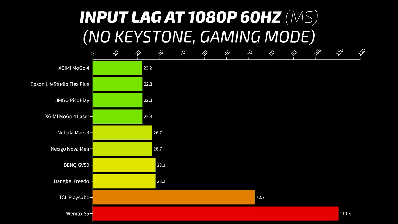 If you want to play video games on your projector I also measured the input lag at 1080p60Hz which is the time it takes for you to see an action on screen once you press a button on the controller and in general input lag numbers under 20 ms are excellent for gaming, between 20-50 ms is fine for casual gaming, between 50-100 ms can start to feel strange, and input lag numbers over 100 ms won’t work for gaming. None of the projectors came up under 20 ms, but most were between 20-30 ms with only the TCL PlayCube coming in at 72.7 ms despite having a gaming mode. The Wemax S5 could only muster 110.3 ms, which pretty much rules it out for gaming.