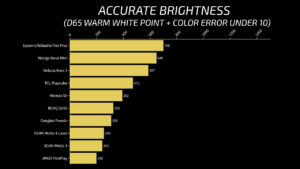 Last, I measured what I call their accurate lumens, which is what you would want to use when watching movies with higher color accuracy and a warmer white balance. While the Epson LifeStudio Flex Plus still came out on top, the NexiGo Nova Mini was not far behind.