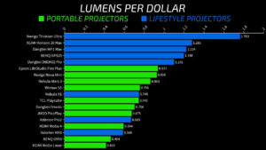 My problem with portable projectors in general is that even though their overall price might seem low, none of them are competitive with non-portable projectors from a lumens per dollar standpoint. Similarly, all of their picture quality rankings need to be qualified by saying that they look good relative to other portable projectors.