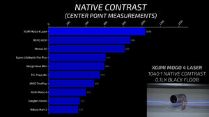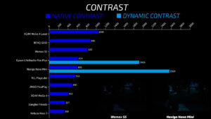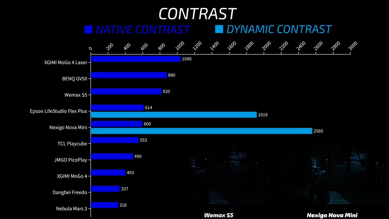 Looking at native contrast first, the XGIMI Laser, BENQ GV50, and Wemax S5 were all respectable with black floors under 0.2 lux, but the NexiGo and Epson both have dynamic dimming, which can lower the power to the light source in darker scenes significantly increasing their contrast to more than double the best native contrast values.