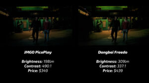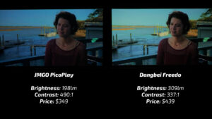 However, how well a dynamic dimming system works is impossible to know without watching real content. So next, I put each projector head-to-head on 100” screens, starting with the two least expensive projectors, the $349 JMGO PicoPlay on the left and the $439 Dangbei Freedo on the right. Having just come from reviewing two 3000 lumen projectors, both of these looked incredibly dim to me which tends to cause them to look flat and uninteresting even in bright scenes, and you can also see that neither projector is particularly color accurate with the JMGO leaning much more blue while the Dangbei looks pretty green.