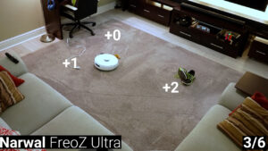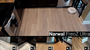 After that with an MSRP of $1499 and sale prices around $1099, the Narwal Freo Z Ultra is Narwal’s first robotic vacuum with an auto empty dustbin. But compared to the 18,000 pascals of suction on the ECOVACS, the Narwal has just 12,000 pascals. In its 35 minute vacuuming run, the Freo Z Ultra picked up just 14.7 grams or 36.75% of the flour, salt, flax, and rice mixture. However, the new auto empty system worked extremely well and after the auto empty process the Freo Z Ultra had 0 grams left in its dustbin.