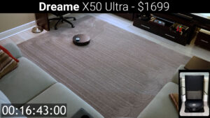 Next with an MSRP of $1699 is the Dreame X50 Ultra with a claimed 20,000 pascals of suction and Dreame’s new DuoBrush system. The X50 cleaned for 35 minutes and picked up 28.7grams, or 71.75% of the flour, salt, flax, and rice mixture, which is almost exactly the same as the Roborock Saros 10R. But it did leave twice as much debris, or 2.2grams, in its dustbin after the auto empty process.