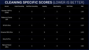 Converting all the results into numeric scores, the Roborock Saros 10R and Dreame X50 Ultra were neck and neck with the Dreame having the advantage of better object recognition and avoidance and better threshold crossing ability while the Roborock was better at edge mopping and had better clearance for cleaning under furniture.